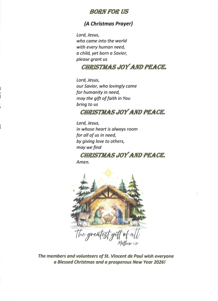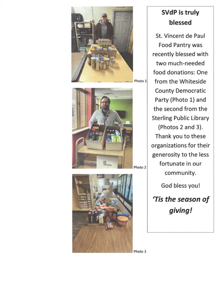 St. Mary’s School principal, Melanie Selmi (right), presents a generous monetary donation to SVdP member, Jenny Terveer (left) as a result of the School’s Christmas Project. Thank you to Ms. Selmi and the entire St. Mary’s School for choosing St. Vincent de Paul Food Pantry as their project during this Christmas Season and making a generous donation to help those less fortunate in our community.