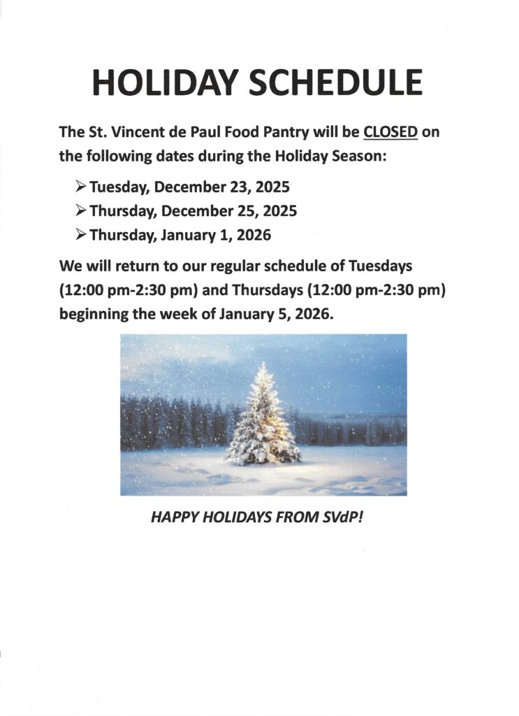 And it is God’s will that we see and serve Him in the poor, in the despairing, in the hungry, the prisoner, the stranger, and the sick. We offer them not only our affection, but our time, talents, possessions and ourselves. Thank you for serving God and those less fortunate through your gift to St. Vincent de Paul Society.