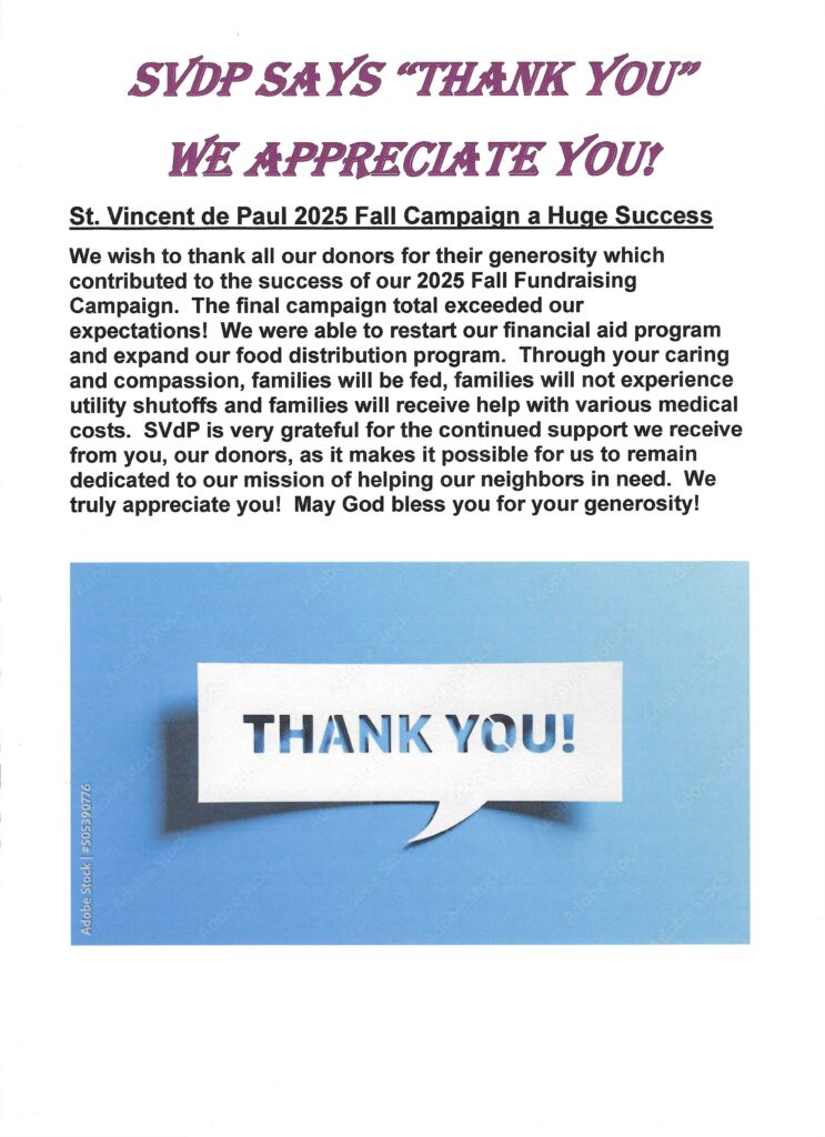 And it is God’s will that we see and serve Him in the poor, in the despairing, in the hungry, the prisoner, the stranger, and the sick. We offer them not only our affection, but our time, talents, possessions and ourselves. Thank you for serving God and those less fortunate through your gift to St. Vincent de Paul Society.